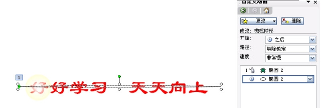 接下來的操作是給圖形設置動畫。右擊圓形,選擇“自定義動畫”,單擊“自定義動畫”窗格中的“添加效果”按鈕,選擇“進入”中的“出現”。再選中圓形,單擊“添加效果”按鈕,選擇“動作路徑”中的“其他動作路徑”下的“橄欖球形”,點擊“確定”后拖動出現的調節柄,盡量把它壓扁并調整長度,使之覆蓋整行文字。然后設置“開始”為“之后”,“速度”為“非常慢”。在“自定義動畫”窗格的已添加效果列表中,右擊第二項橄欖球形橢圓2,選擇“效果選項”,在“動畫播放后”欄選擇“播放動畫后隱藏”,切換到“計時”選項卡,設置“重復”為“直到下一次單擊”,這里可以根據你具體情況設置(圖2)。