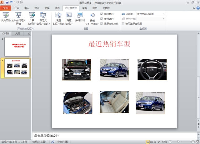 用同樣的方法在幻燈片中添加其他的Microsoft PowerPoint演示文稿對象,填充需要的圖片,直至把所有需要的圖片都填充添加完畢(圖3),這樣點小圖看大圖的縮略圖效果就完成了,演示的時候只要單擊幻燈片上的汽車圖片,就自動打開該圖片的全屏清晰大圖。