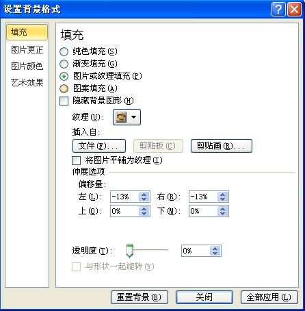 插入成功后,在改幻燈片編輯區里就會出現一個類似于“圖片”的對象框,這就是剛剛插入的演示文稿,選中該對象框,可以看到幻燈片編輯區內有8個黑色的控制焦點,可以拖動它,調節其大小,再把該對象框拖動到合適位置。選中后右鍵單擊,在彈出菜單中選擇“設置背景格式”,然后在“填充”選項中選擇“圖片或紋理填充”(圖2)。