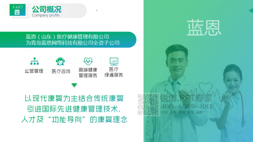 — 說明:選用了能給人帶來生機勃勃感受的綠色和白色作為搭配,能給人帶來干凈、明亮又淡雅的感覺,符合品牌藍恩醫療的調性。將文稿中大量的資料通過提取的方式進行新的制作,給觀看者帶來簡潔明了的感受。