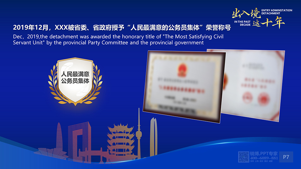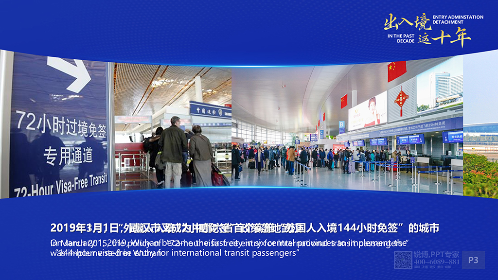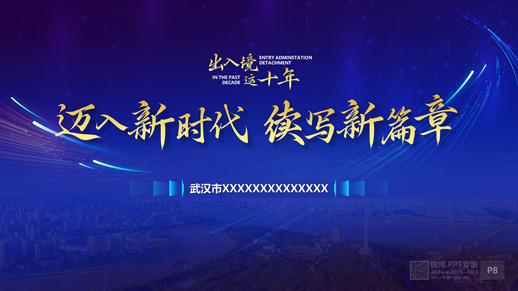 該ppt整體視覺穩重大氣、簡潔明快,頁面實用美觀、介紹齊全,出入境十年間的工作及服務在此體現得美倫美幻。